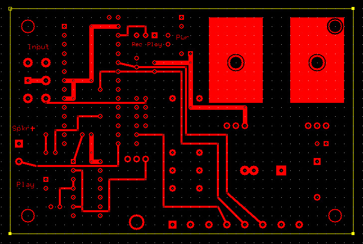 The actual circuit for using the ChipCorder chip is fairly straightforward. I added a header with a little jumper on it so I could record audio from my computer into the chip, then move the jumper and it would play back every time I pushed the Start button. It's the yellow box with the Rec / Play below it on the Silkscreen view of the board..